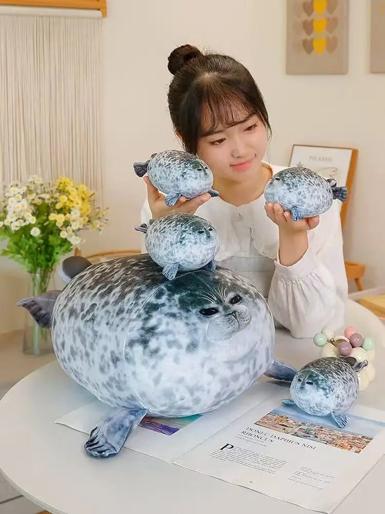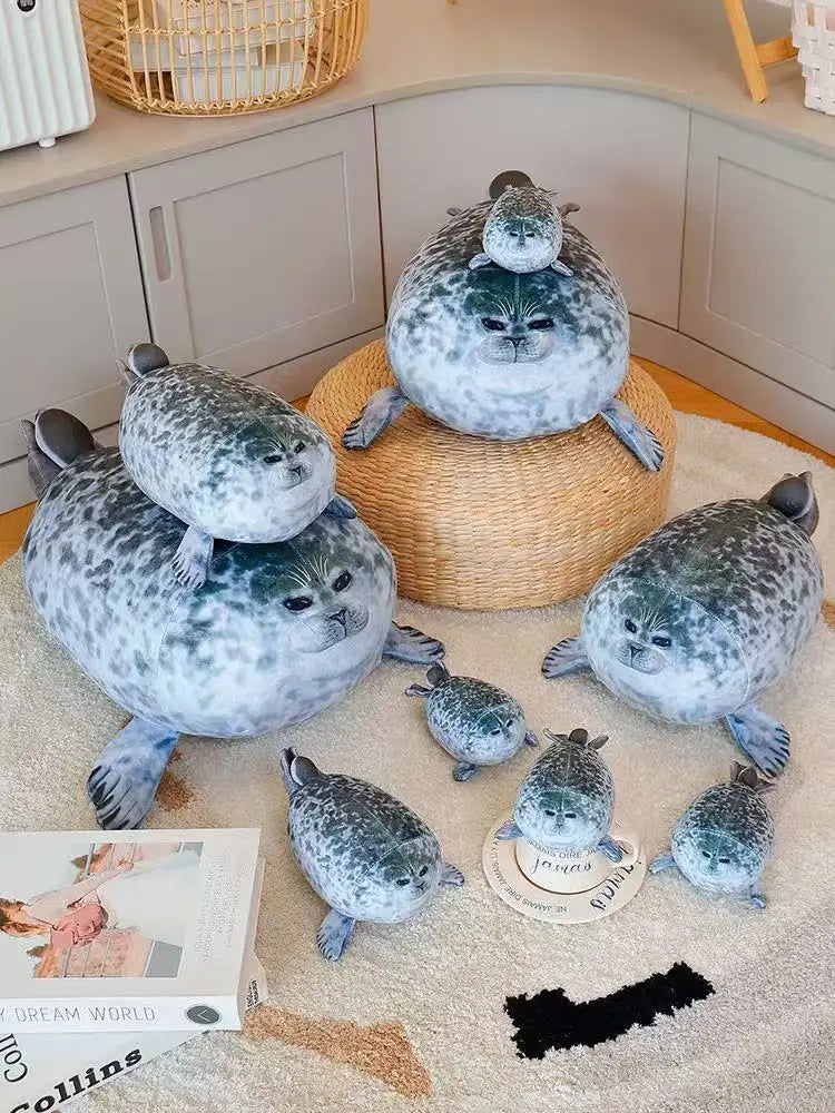 Sure, here are five descriptions for your product, the 20/30/40/50 cm New Simulation Mother and Child Seal Doll Plush Toy Cartoon Anime Cute Pillow Children's Birthday Gift Doll: